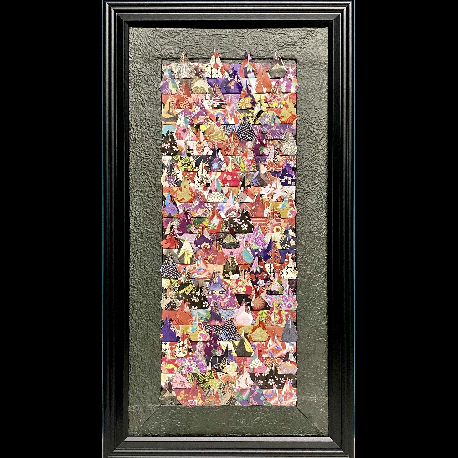 Saya may fold dozens of origami creations at a time while, all with a theme in mind. Many will later wind up placed on a canvas, such as a recent creation entitled “Departures” which features numerous origami pieces placed on four 24×24 panels.