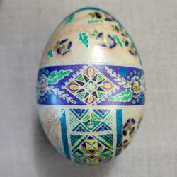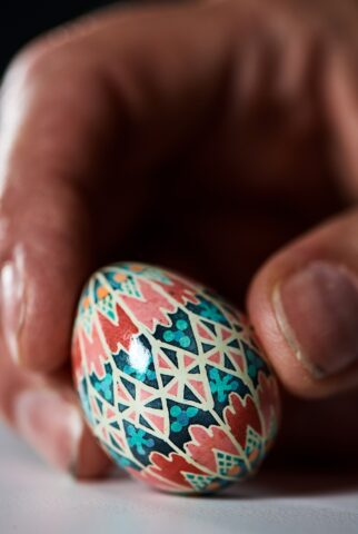 “This art form that I do is on real blown eggs,” she says. “There are many ways of decorating eggs that you can find throughout the world, especially in Eastern and Central Europe. I decorate using molten beeswax directly on real egg shells from poultry and dyes. It’s a wax resist process. When the wax is removed, a brilliant design is revealed.”