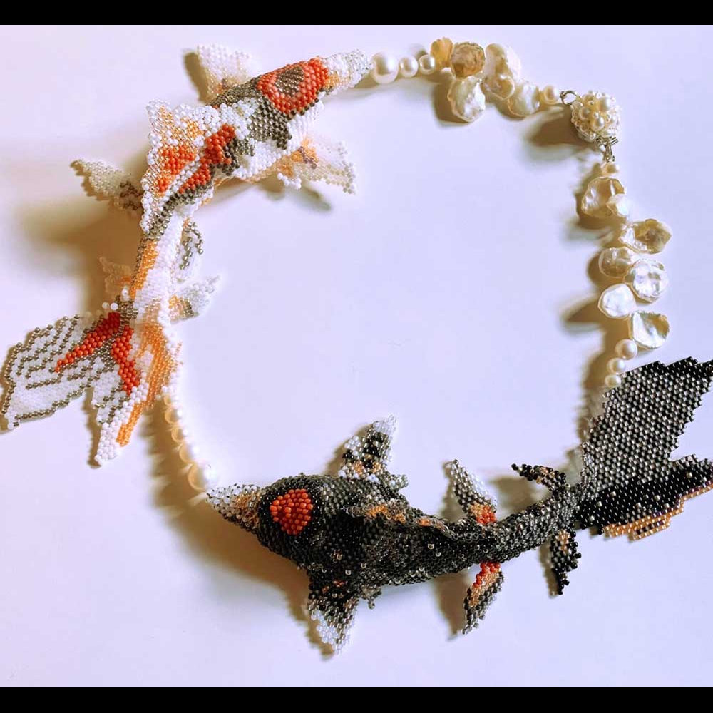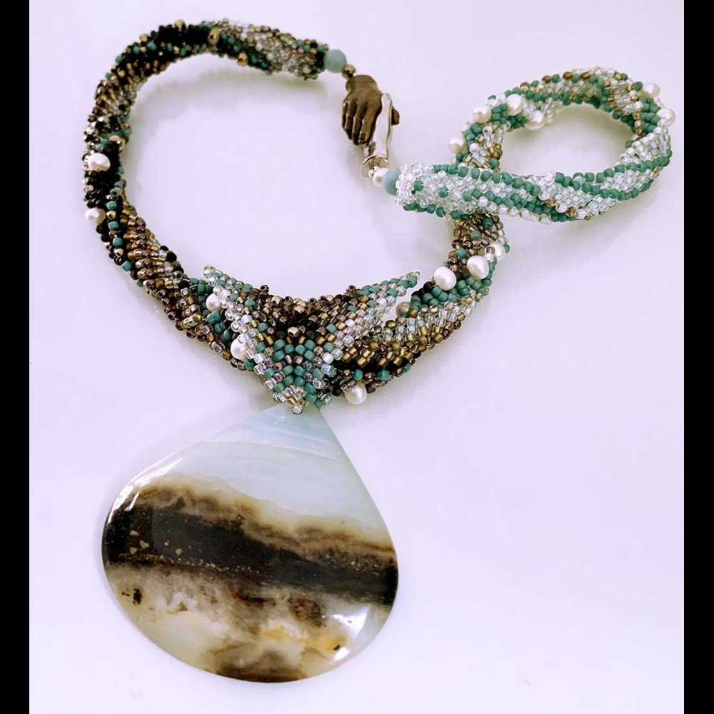Intricate bead-weaving by hand, using tiny glass "seed" beads, gemstones, and a needle thinner than a cat's whisker.