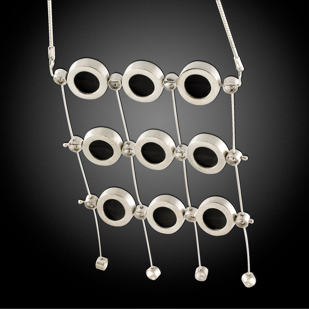 The Jewelry is inspired by functional forms (ranging from everyday objects to industrial elements) travel experiences, nature, people and architecture, These shapes are softened, round and sensual with a combination of polished and textured surfaces, which flow together to create a sense of movement. A combination of wax carving and hand fabricating is employed to form the various collections. Hammering marks, forging techniques and multiple soldering styles are also used. Although the pieces have a modern feel, they are, at their core, timeless. The unique blend of masculine and feminine tones transcends the gender specific. Crafting in sterling silver and gold, accented by black neoprene, gemstones, pearls and found objects creates a visual and tactile elegance, suitable for casual or formal settings.