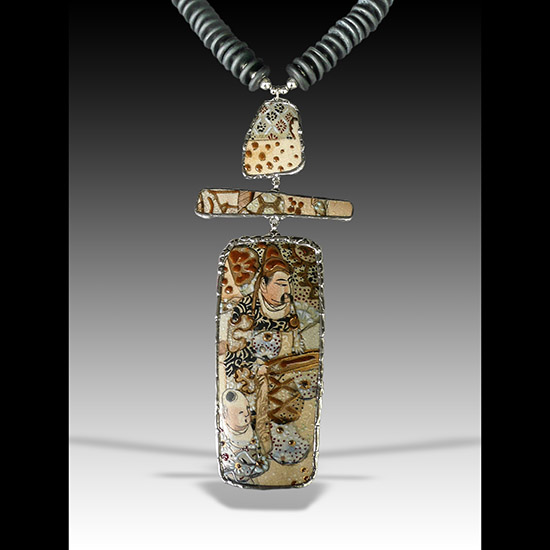 I use vintage, antique and found objects to make jewelry which I set in sterling silver and other materials. I work with antique Japanese vases, antique English plates as well as any items I find that I incorporate into my work.
