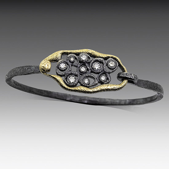 Each item is a unique piece of art that allows the wearer to share in the energy and inspiration that created it. My jewelry pieces are inspired by rivers, especially the rush of water over stones, and by the textures in ancient forged iron. The pieces are characterized by using asymmetry to create balance and a sense of movement. By fusing these concepts, I intend to arouse delight in the handmade, creating pieces with a distinctive approach to elegance. In creating these pieces, I’m focusing on the feeling I get when in nature, particularly near a stream; the smell and sounds of fresh rushing water, bouncing off of ancient rock formations is mesmerizing and energizing. In wearing these pieces when back in the city, I am reminded of the power of nature. The pieces are meant to be worn every day, they are not formal, rather they are meant to be a part of your life to take on the dents and scratches and to be more beautiful in showing evidence of life's journey.