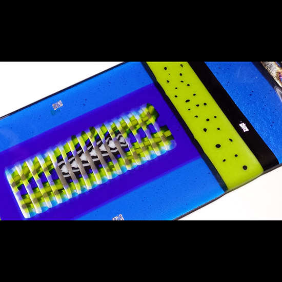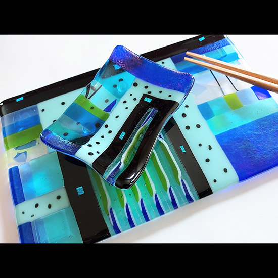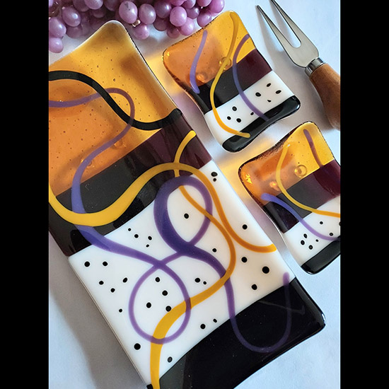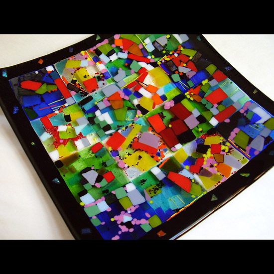 RoseAnna's creates fused glass giftware by hand cutting sheets of glass, kiln firing multiple times, cold working, sandblasting, and torch working many designs to achieve final piece.