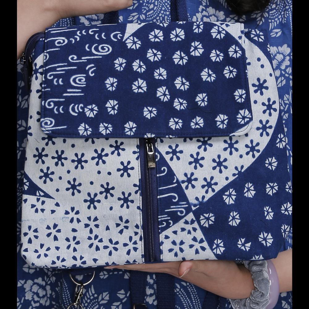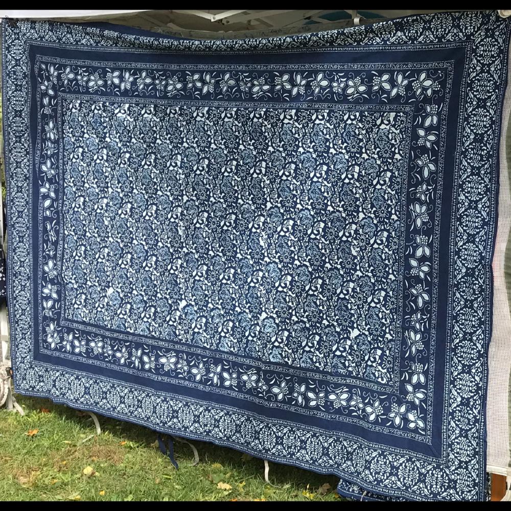 hand dyed 100% cotton with natural indigo plants,soy-paste resist to create pattern,washing ,drying ,sewing to bags,tablecloths etc.My daughter Phoenix start to work with me since 2018,she added many geometric design, give traditional pattern a new life,we developed many modern style.