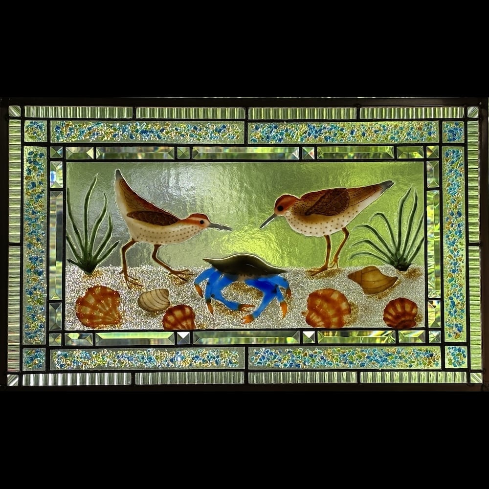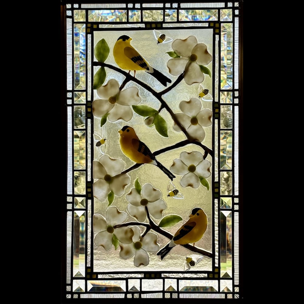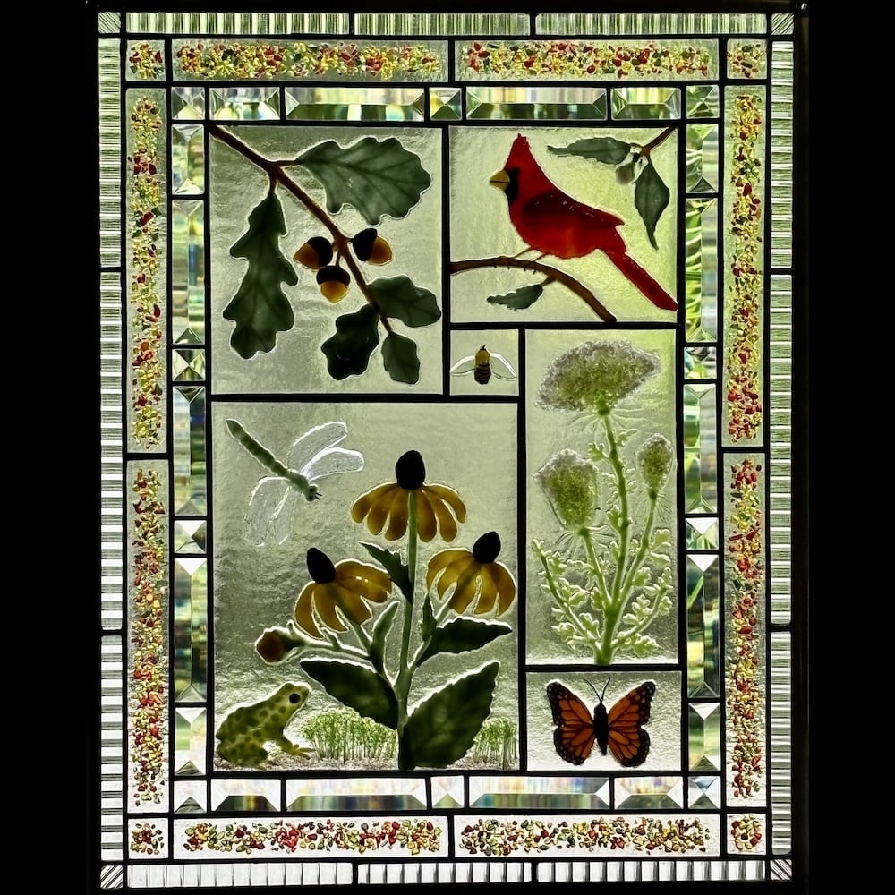 Fused glass botanicals are created by sculpting glass powders to specific shapes, with several kiln firings for a dimensional surface. Final construction of leaded glass borders finished the pieces.