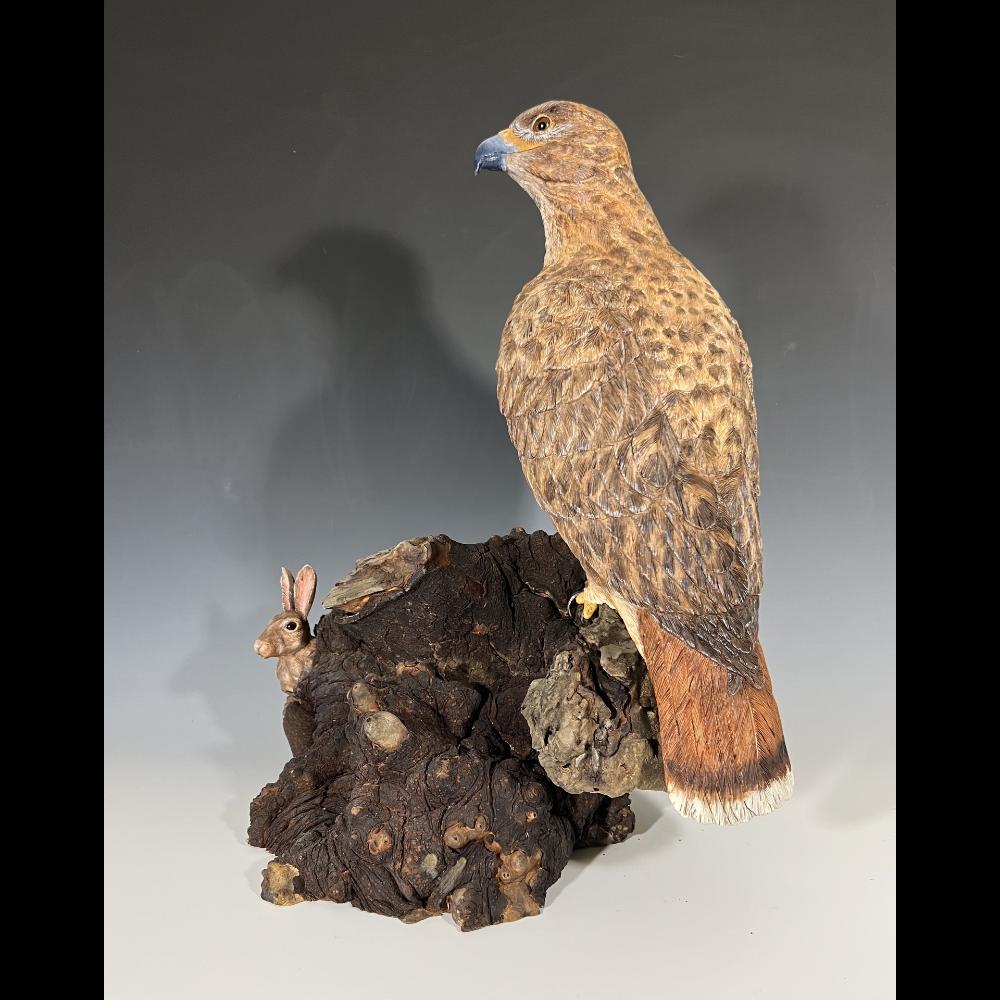 The addition of embellishment to my work has greatly influenced and strengthened my sculptural practice. I carve full-sized raptors, a process that demands extremely fine detail and multiple layers of colour to achieve a realistic and lifelike presence.