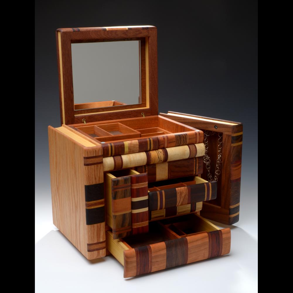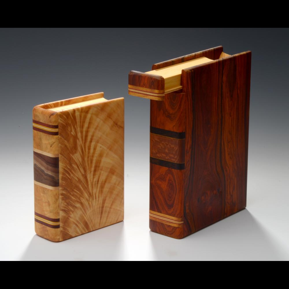 Crafting practical, functional products that are perceived as art is my self-imposed challenge. I am on a continuous hunt for interesting exotic species of wood or unusual variations of more common ones. To my mind, “flaws” of nature are points of interest. After I collect a natural piece of wood, I live with it sometimes for years until its potential becomes apparent. Its character controls its destiny by determining the finished product. In the end, I attempt to make art transcend the craft. In recent years I have developed a line of wood boxes that resemble realistic books, but open in various unexpected and surprising ways. It is entertaining for me to watch craft show visitors play with each book and try to uncover its secret. This human response is my reward as well as my motivation for experimenting with new ideas every chance I get.