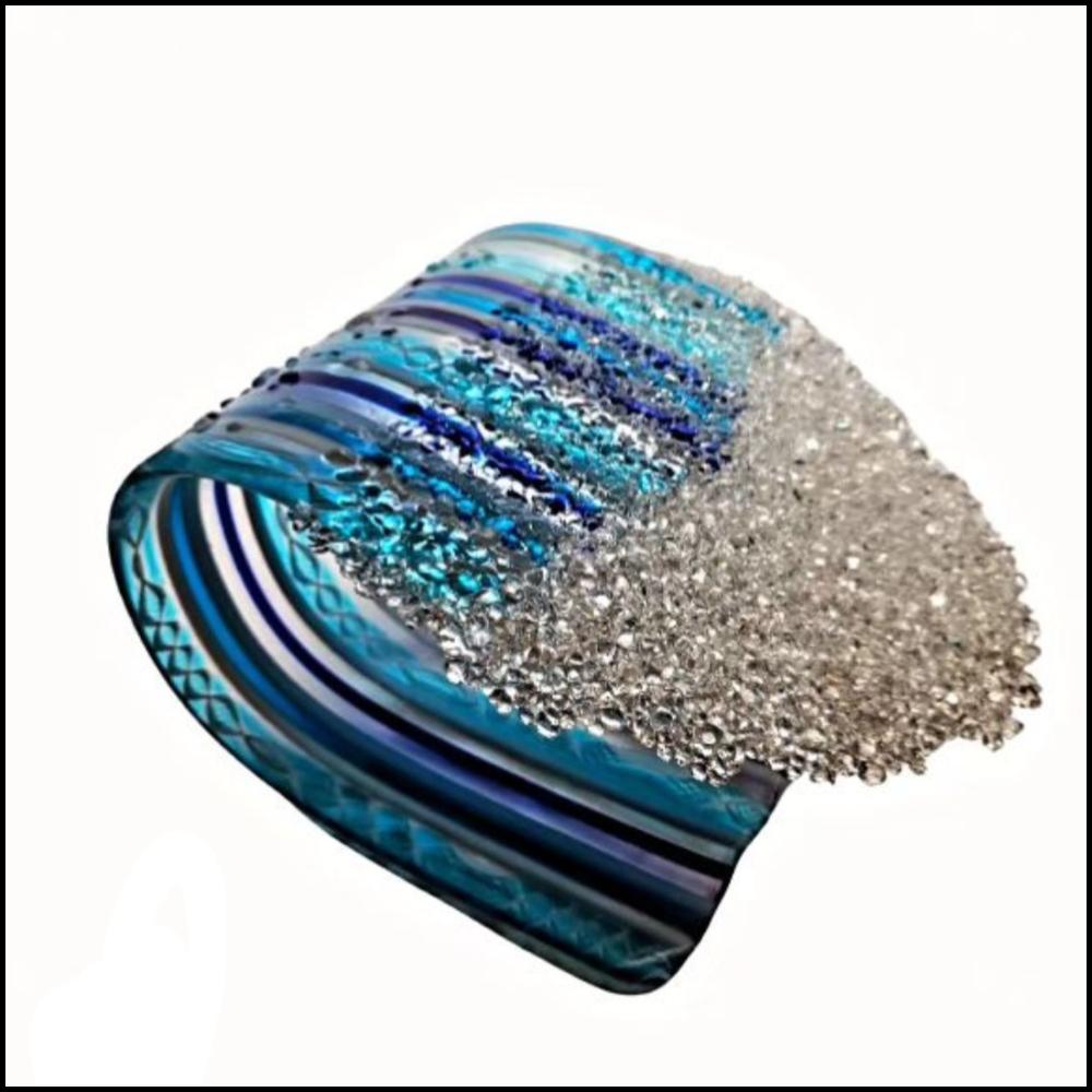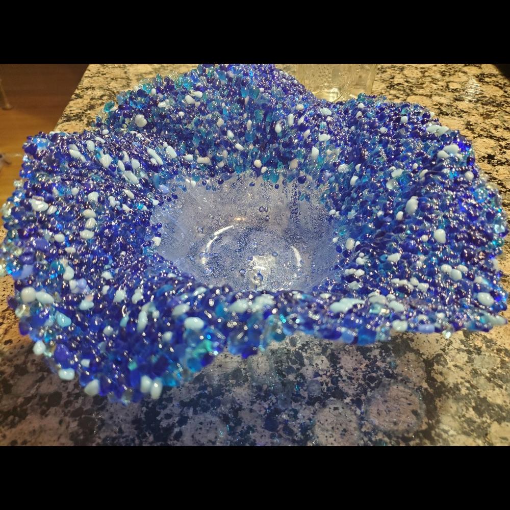 Arte Blanche is a woman owned glass company that is both socially and environmentally conscious. My style is fun and functional. All of my glass is sourced within the United States and handmade from a mixture of my love for creativity and my degree in Chemistry. My art is a reflection of my desire to have unique, colorful, and functional glass that can either be displayed for pleasure or used in everyday life. My glass art is kiln work, sometimes including vitrograph or lampworked inclusions. All of my art is handmade from a mixture of my love for creativity and my degree in Chemistry. I love to push the boundaries of what I can do with kilnworked glass. An example of this are my 3D glass waves that I pull out of the kiln and bend by hand to create a more realistic effect.