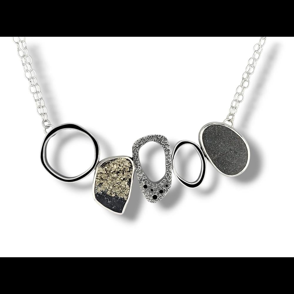 My jewelry is inspired by my experience of the natural world around me. I explore shapes, textures, patterns and surfaces found in the environment and also sometimes in biological structures at the microscopic level. Jewelry allows me to pursue my long-term interest in organic forms and expand at a three dimensional level upon ideas I've explored in other media. River rocks and natural stones have been of particular interest to me, with the irregular contours of their forms and their surfaces often inspiring my designs. Sometimes, arrangements found in natural environments inspire textures and patterns in, and compositions of, my pieces. The shapes of bones and unique patterns of bone interiors have also inspired some of my pierced designs. I enjoy creating one-of-a-kind, contemporary designs that have strong contrasts. My pieces are not meant to be delicate; they are intended to make a dramatic statement for the wearer.