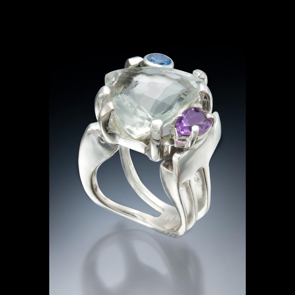 Inspired by the structures of nature and architecture, I build my pieces through a constructivist process. Every element is hand made and soldered together forming unique works that grow organically thru construction. All stones are hand picked and precious.