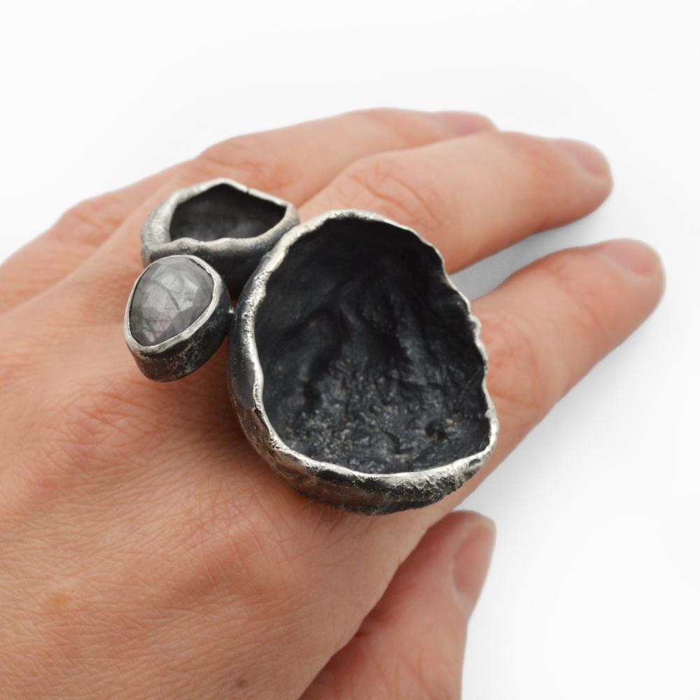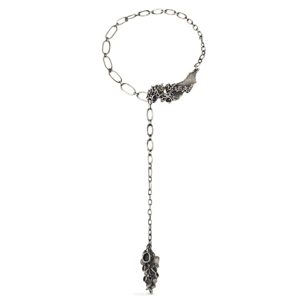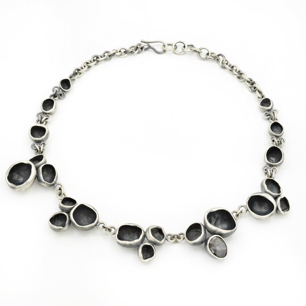 Working with hammer forging, fabrication, soldering, and reticulation, I shape hand-formed elements—discs, links, and fragments—into flowing, organic compositions. Natural stones and leather are often integrated, contrasting the precision of silver with tactile, organic surfaces. Patinas and textures deepen the forms, creating subtle shifts of light, shadow, and pattern.