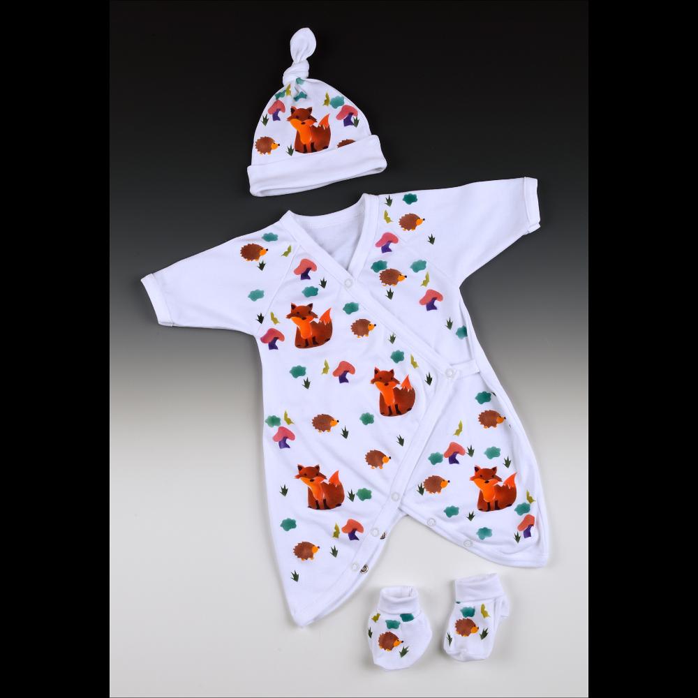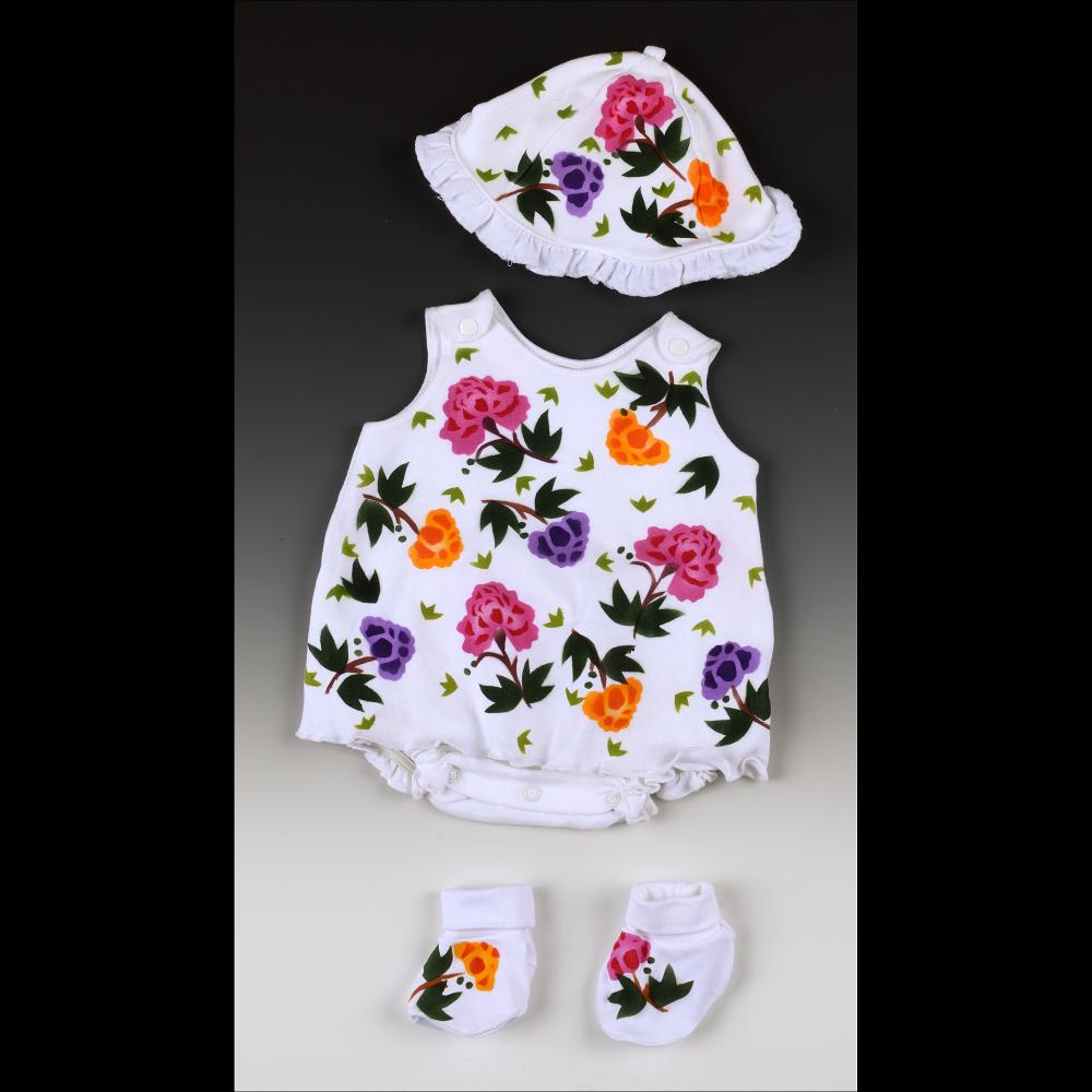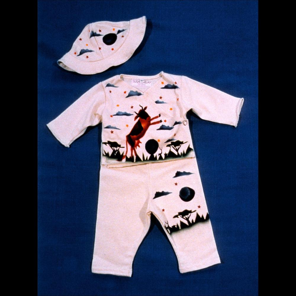 I design, cut, sew, dye and hand paint wearable art using cuddly natural fabrics & hand mixed, eco-friendly dyes for children and infants. My whimsical designs utilize recognizable images and are painted in a rainbow of vibrant color, depicting nature in all its wonderful splendor.