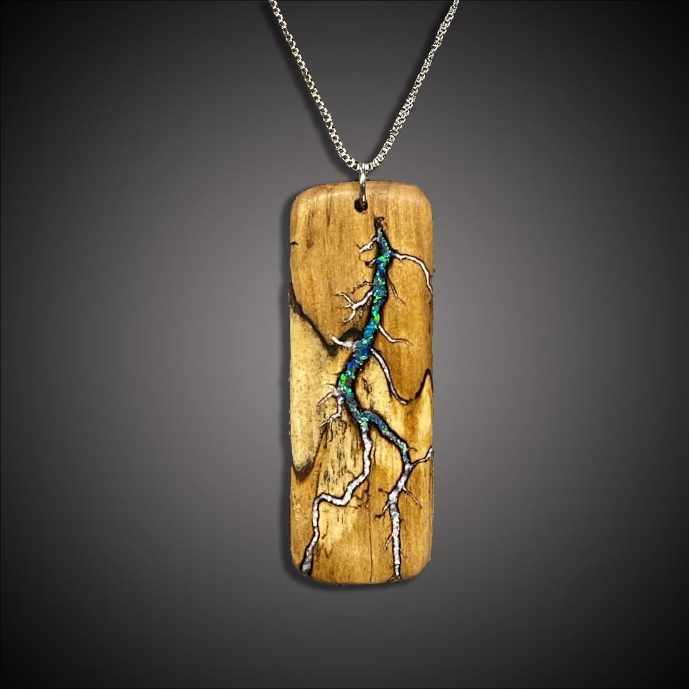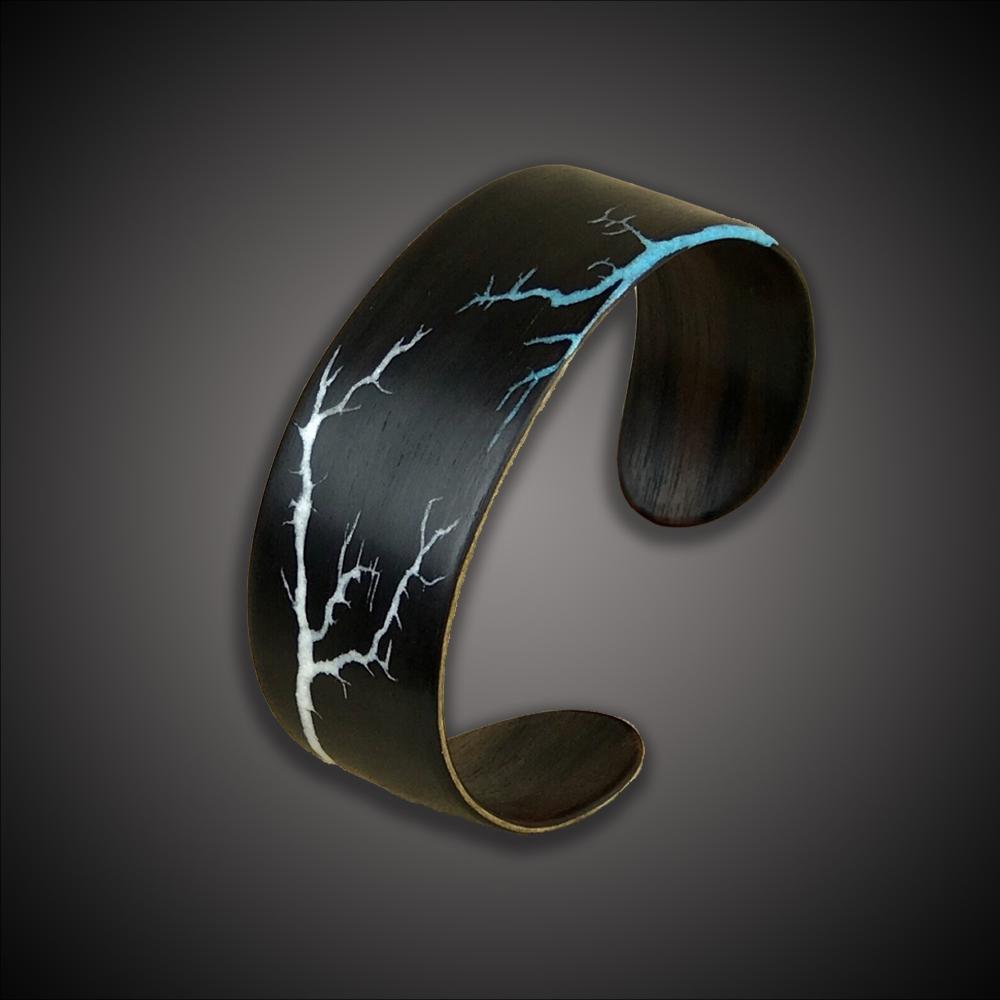 Wood Jewelry handmade by blending science, nature and art with domestic/exotic woods featuring stone, metal, or meteorite inlay, as well as high voltage Lichtenberg Fractals created from 15,000 volts.