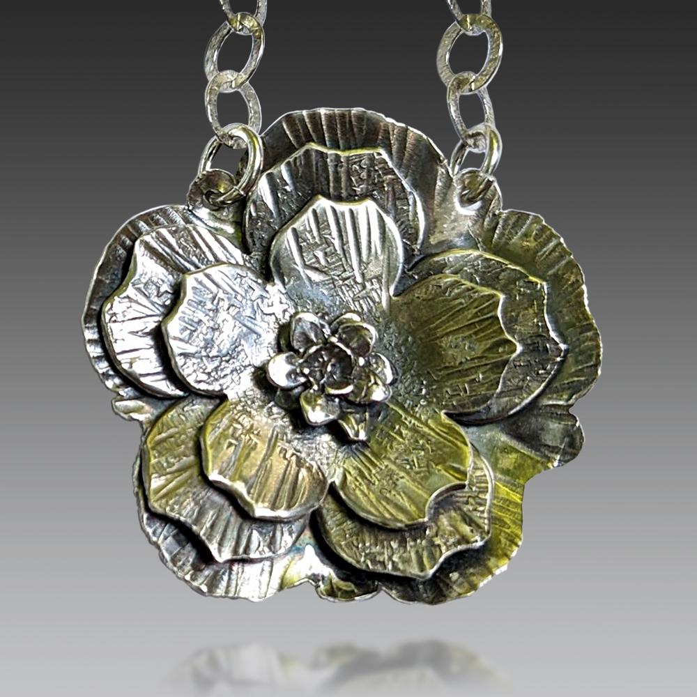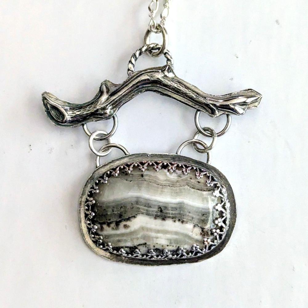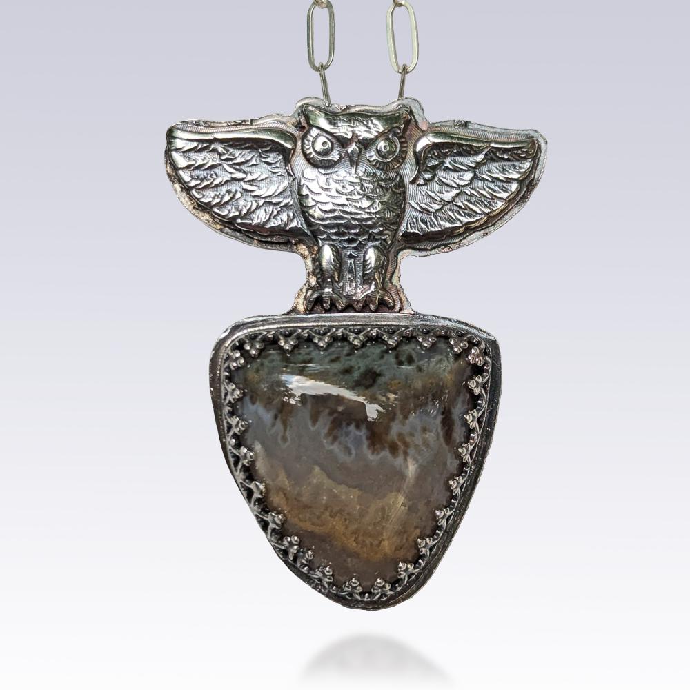 I try my best to create a narrative for my jewelry to tell, often pairing an image of an animal, in metal, with a scene, suggested by a gemstone. For example, a bird soars over a landscape, or a deer leaps over a stream made from an agate cabochon. I want to engage the viewer in imagining a story behind the piece.