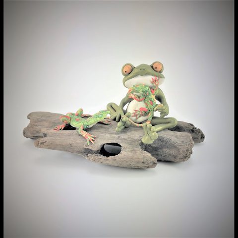 “When I was in my workshop one day, I looked outside and could see lizards perched on some shelves,” she says. “So, I started making lizards, frogs, turtles, and for a while, sea creatures like manatees and sharks.”