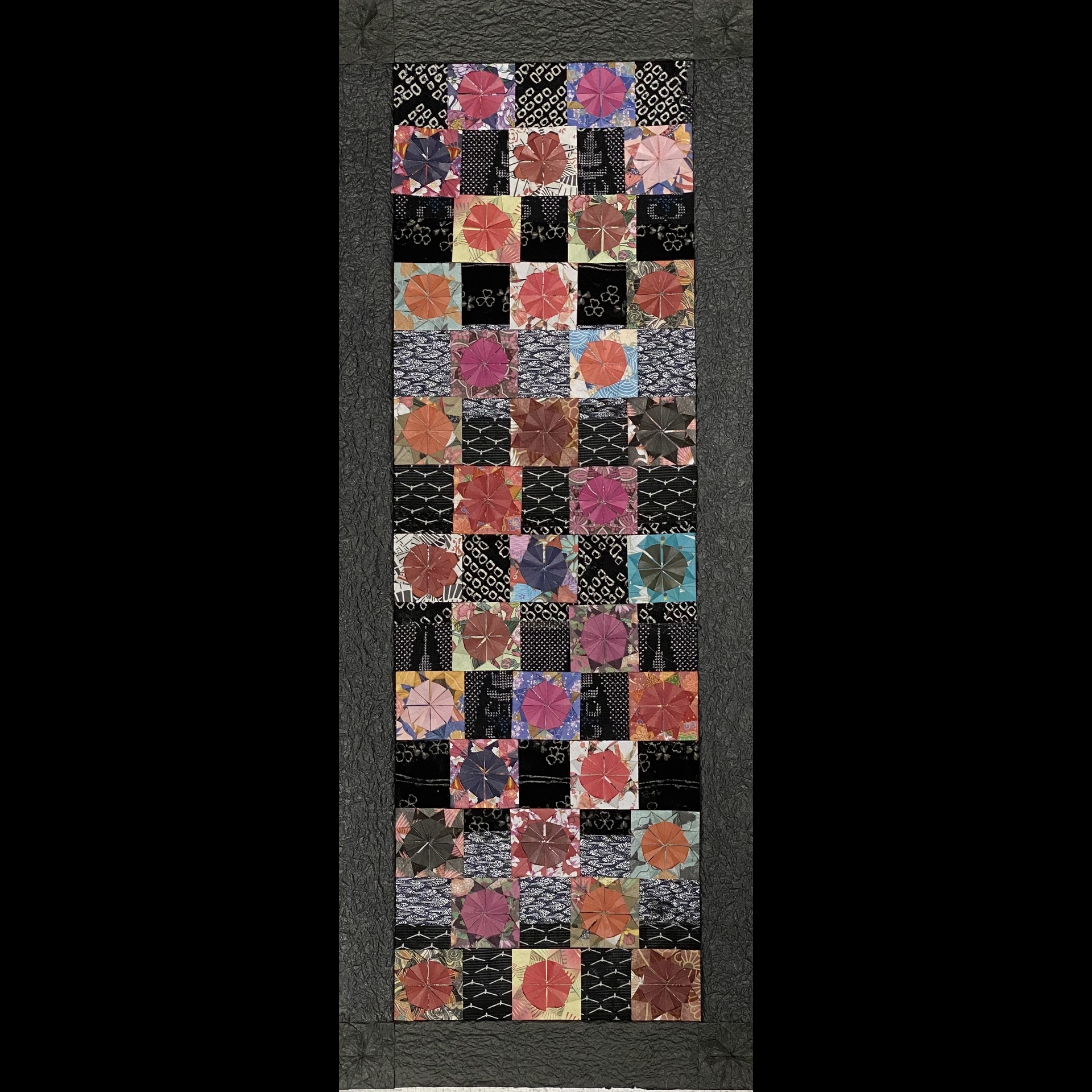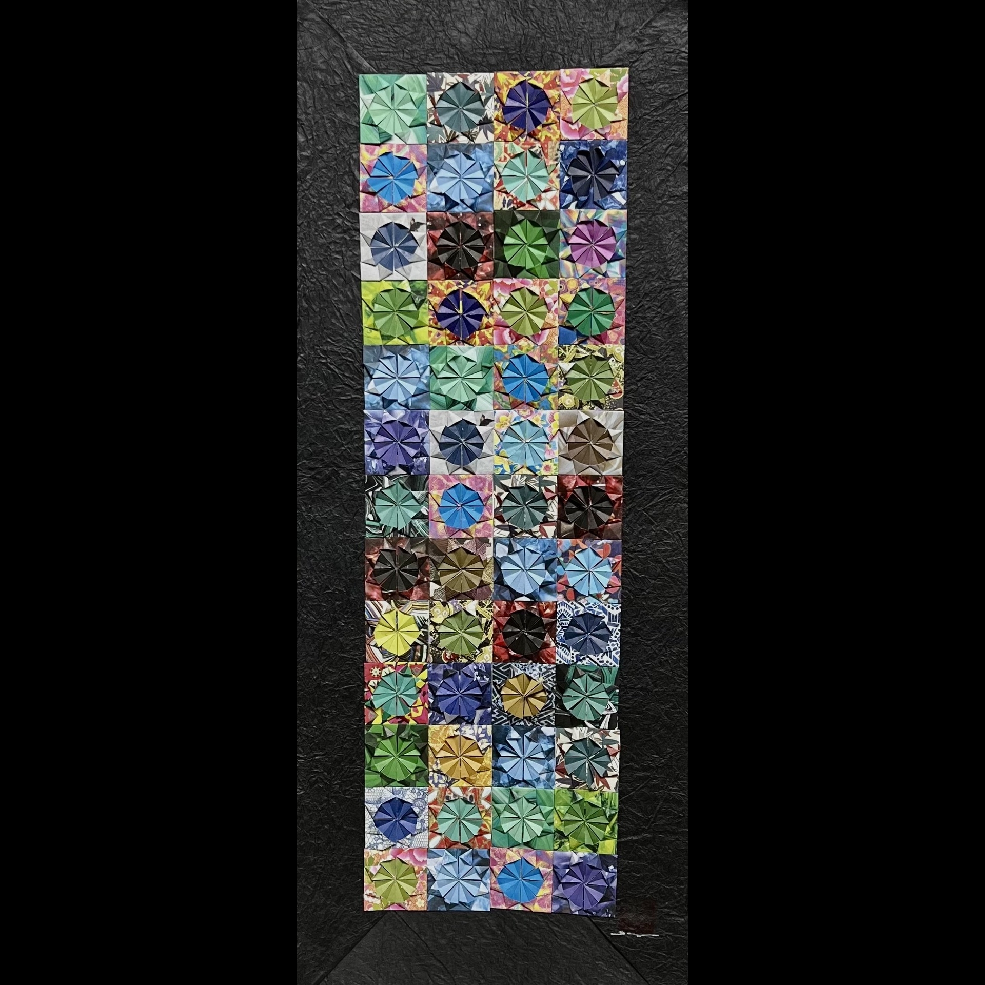 Saya may fold dozens of origami creations at a time while, all with a theme in mind. Many will later wind up placed on a canvas, such as a recent creation entitled “Departures” which features numerous origami pieces placed on four 24×24 panels.