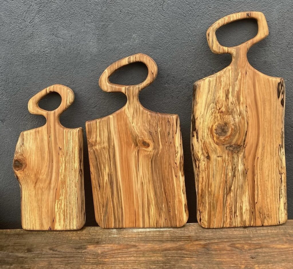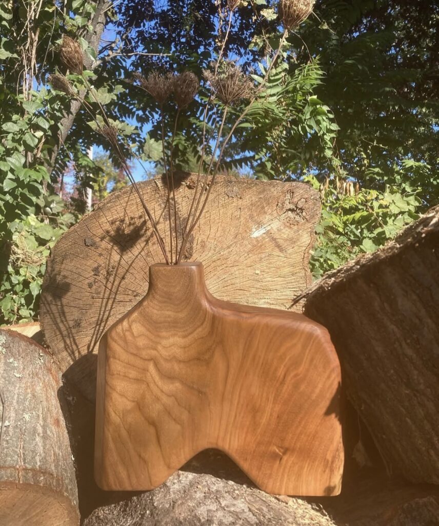 Each charcuterie board is made with a distinctly shaped handle; no two are alike. He’s expanded into making shelves, tables, benches, serving trays, clocks and dry flower vases. He carved a giant whale for a couple in Mystic, Connecticut.