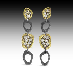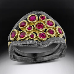 Rivers inspire Rona, particularly the rush of water over stones. Her time in Europe led her to favor the textures in ancient, forged iron. She creates balance by using asymmetry. Her pieces evoke what she feels while near a stream, appealing to all the senses. Ideally the wearer shares in that energy and inspiration.
