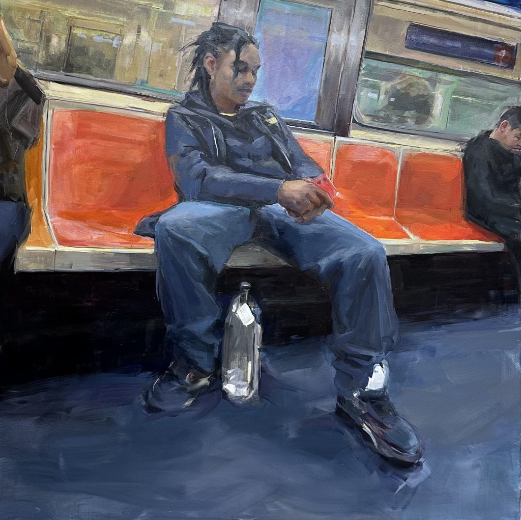 A man in a hooded sweatshirt leaning against a pillar on a subway platform. A bus traveling its evening route after a rain shower. A woman clutching a metal post while standing on a train.