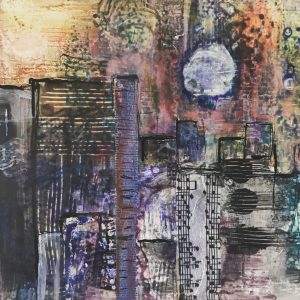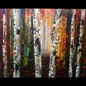 “I don’t have a copyright on the technique, but I don’t know of anyone else doing it quite this way,” says Nemeth, who teaches at Morris County Art Association. “My work is layers and layers of paper. I use paper not as a collage element but as a palate of color. You’ll see print as line, text as line. If I want to add a line, I might cut out a stream of text and put it in the painting. So, the trees in my birches are faces on papers that I shift around to look like bark. No one taught me that. It’s just the evolution of my work.”
