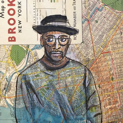Nemeth’s Do You Remember When collection developed during the early uncertainty of the pandemic. She started by drawing a woman’s head on a map, a visualization of the chaos that enveloped most of us in early 2020. Actual maps with street names spelled out in microscopic letters give each of the works in the series a sense of place and familiarity. She created a portrait of Lee, titling it Fort Greene Represent to pay homage to the neighborhood he calls home.